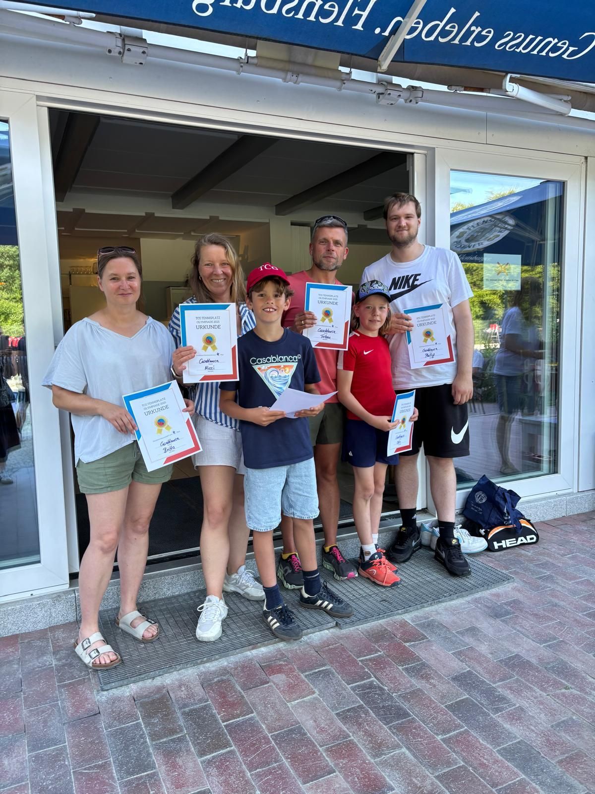 Am Samstag den 19.07. stand im Tennisclub Glücksburg die 1. Tennisplatz Olympiade auf dem Plan. Bei wunderbarem Sommerwetter kämpften rund 30 Teilnehmer, aufgeteilt auf fünf Teams, in zehn verschiedenen Minispielen auf unserer Anlage gegeneinander. Hier wurde vor allem nach Geschicklichkeit unter Zeitdruck gefragt: Von Parkourlauf bis Bälle mit einem Pömpel (natürlich unbenutzt) fangen, war alles dabei. Unsere Olympia-Organisation hatte bei der Erstellung der Spiele auf Spaß für Groß und Klein geachtet, sodass für alle ein fairer Wettkampf gegeben war. Trotz des Wettkampfcharakters stand für alle der Spaß an erster Stelle. Am Ende siegte das Team Golies mit deutlichem Abstand vor Team Techno. Im Anschluss gab es noch ein leckeres Grillbuffet mit gemütlichem Beisammensein.