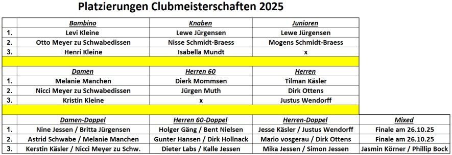Am 20. September fand bei uns im TC Glücksburg der Finaltag der Clubmeisterschaften 2025 statt. Bei weitestgehend gutem Wetter mit strahlenden Sonnenschein konnten rund 131 Zuschauer spannende Begegnungen auf unserer Anlage im Kurpark verfolgen.